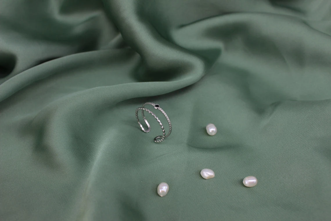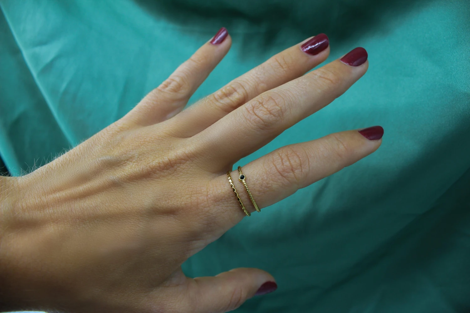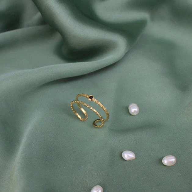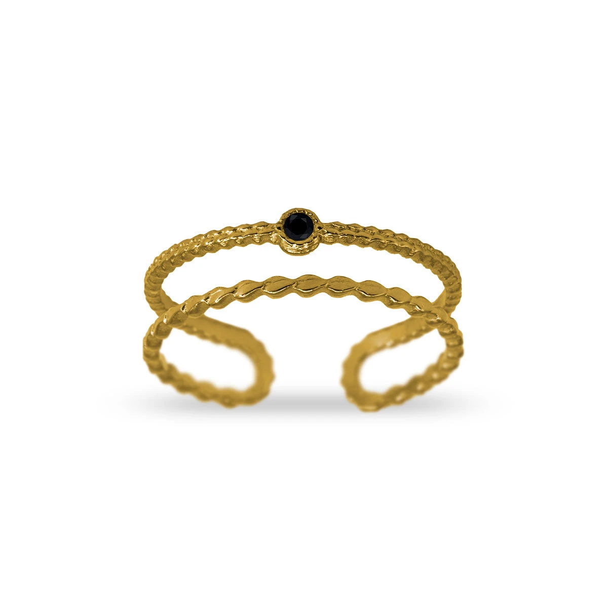 Anillo de acero inoxidable con dos bandas, una con textura y otra lisa. En la mitad de una de las bandas podemos encontrar una pequeña circonita a elegir entre dos colores, negro y blanco. Es ajustable y el dorado es resistente al agua