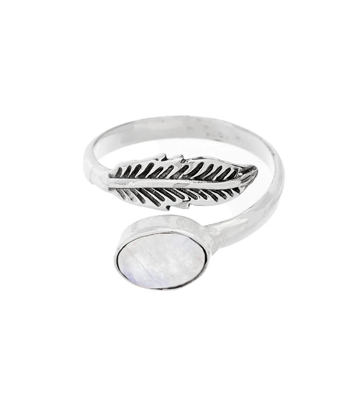 - Anillo ajustable de diseño fino, con detalles labrados que forman una pluma y piedra engarzada