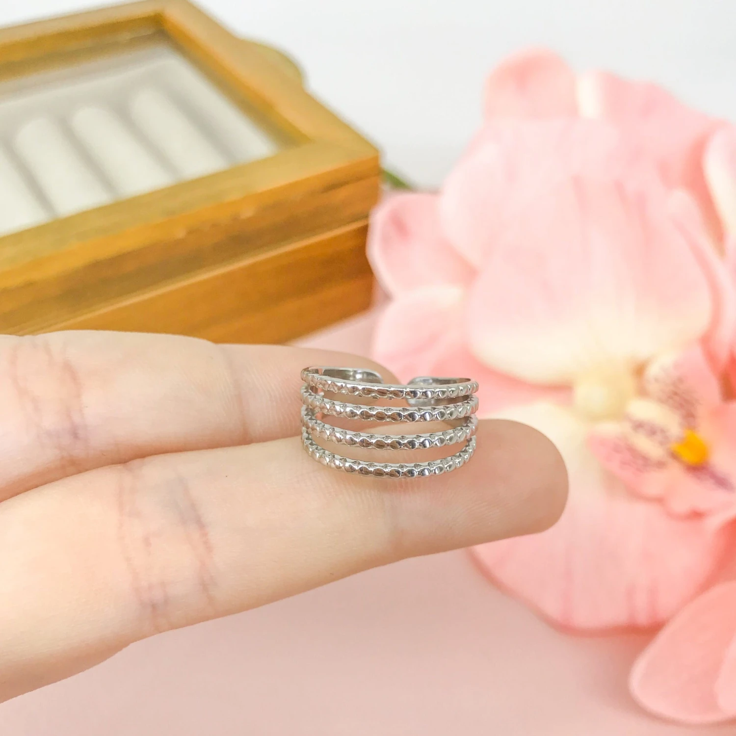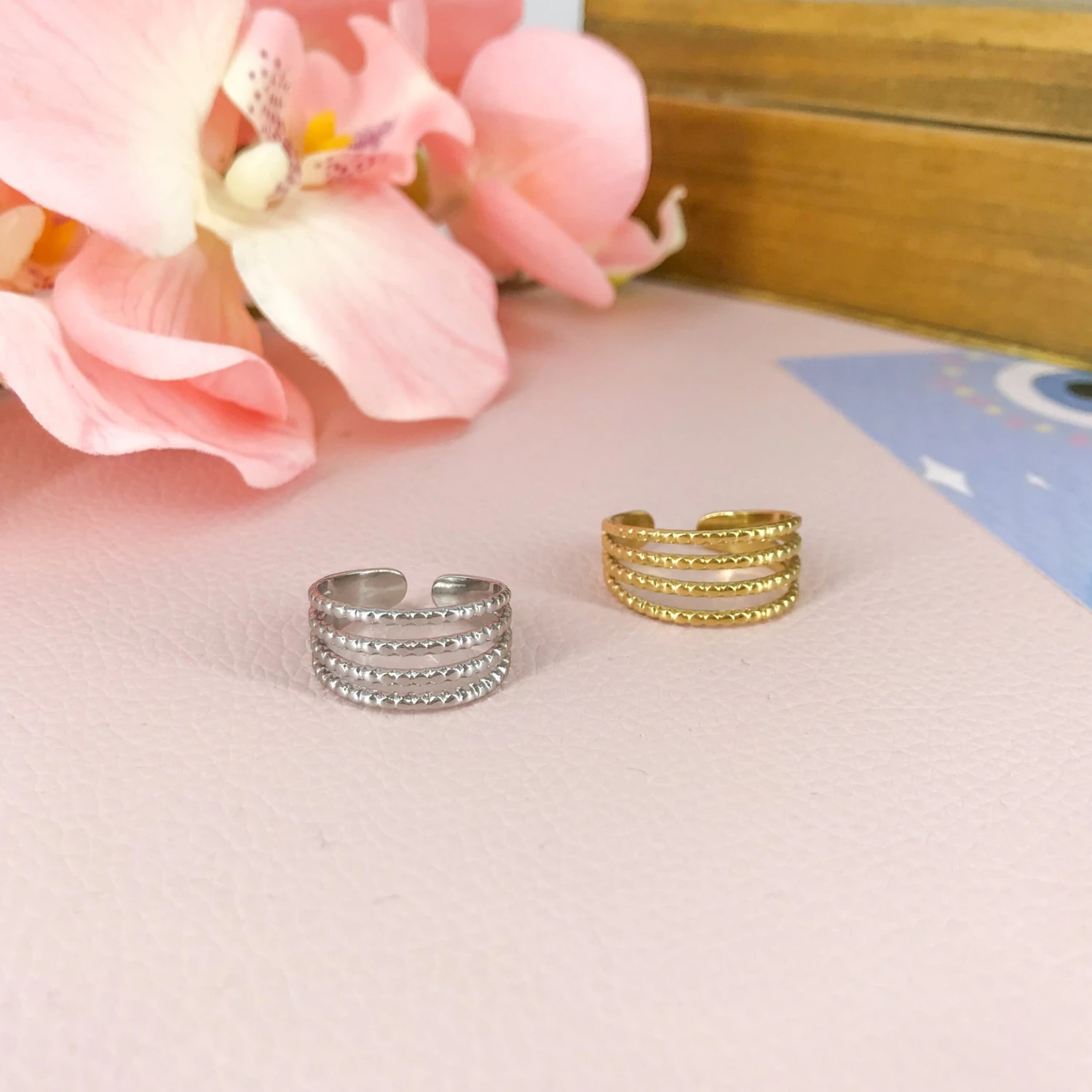 Anillo de acero inoxidable ajustable con cuatro bandas con textura. Es ajustable y muy resistentes para el día a día gracias a su material