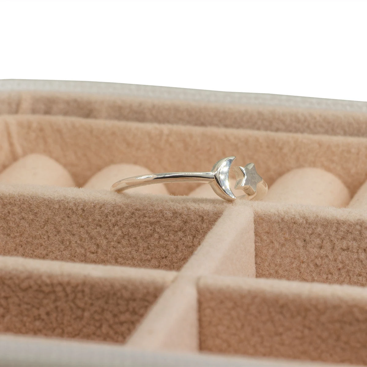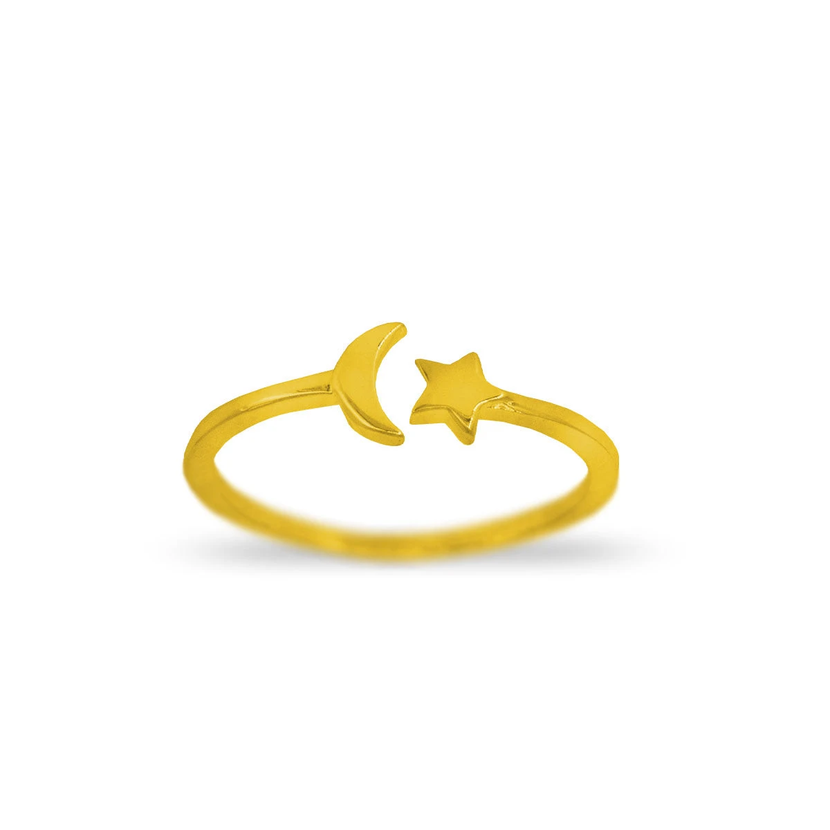 Anillo ajustable de plata con luna y estrella. Este anillo al ser ajustable se adapta facilmente a tu dedo y abarca las tallas de la 12 a la 16.