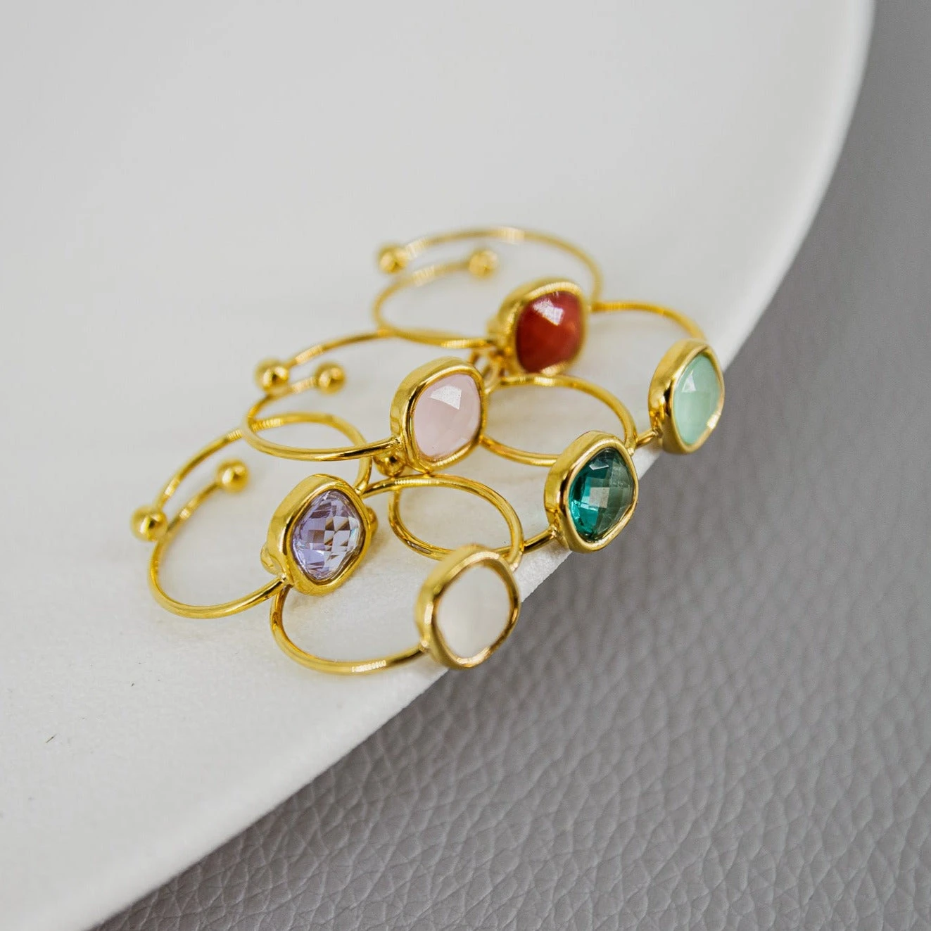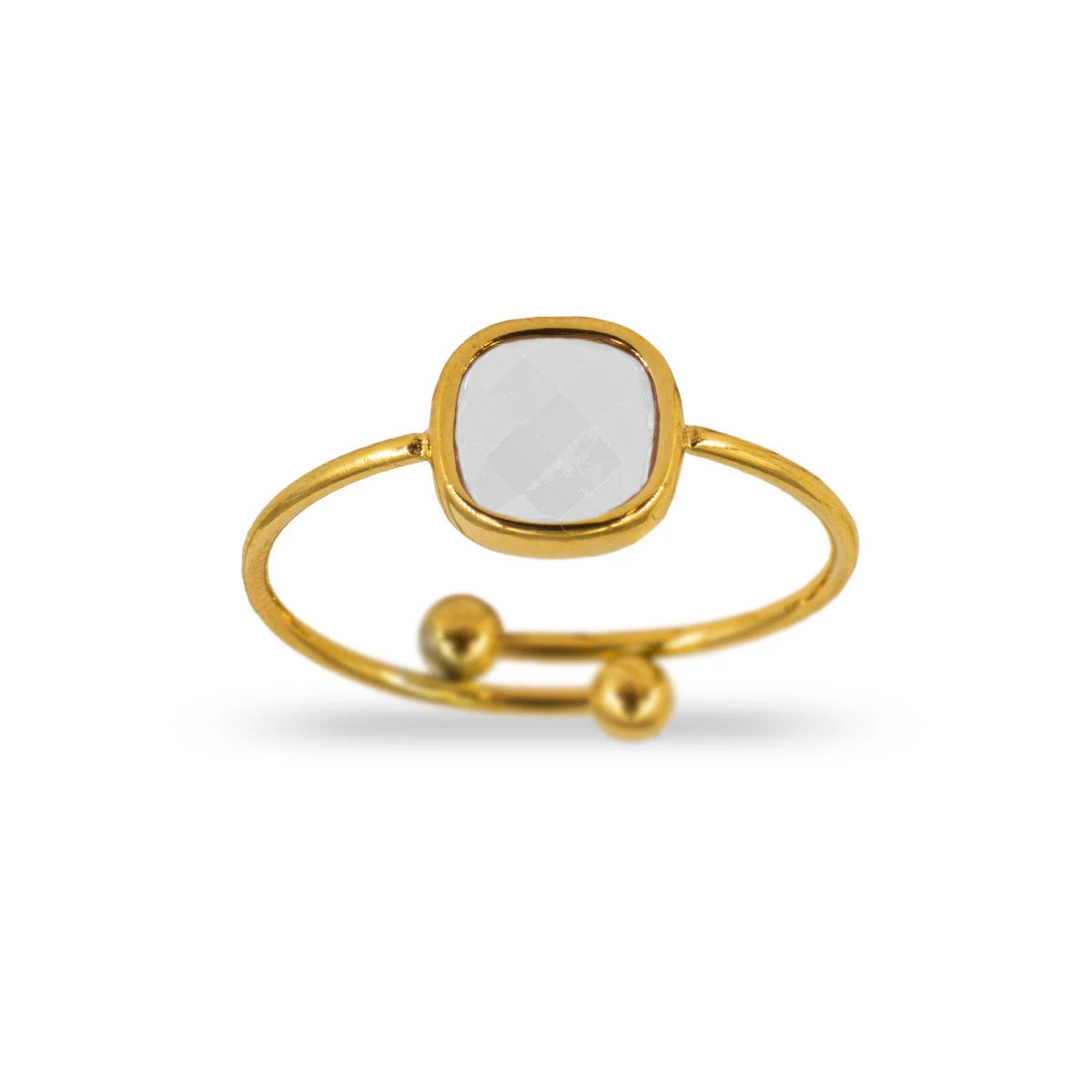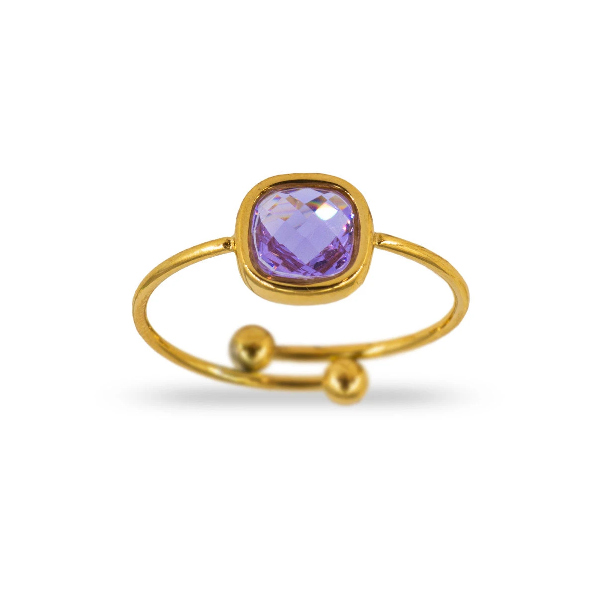 Anillo de acero inoxidable con una circonita cuadrada como pieza central. Tiene un estilo original y elegante. Es ajustable y el dorado es resistente al agua