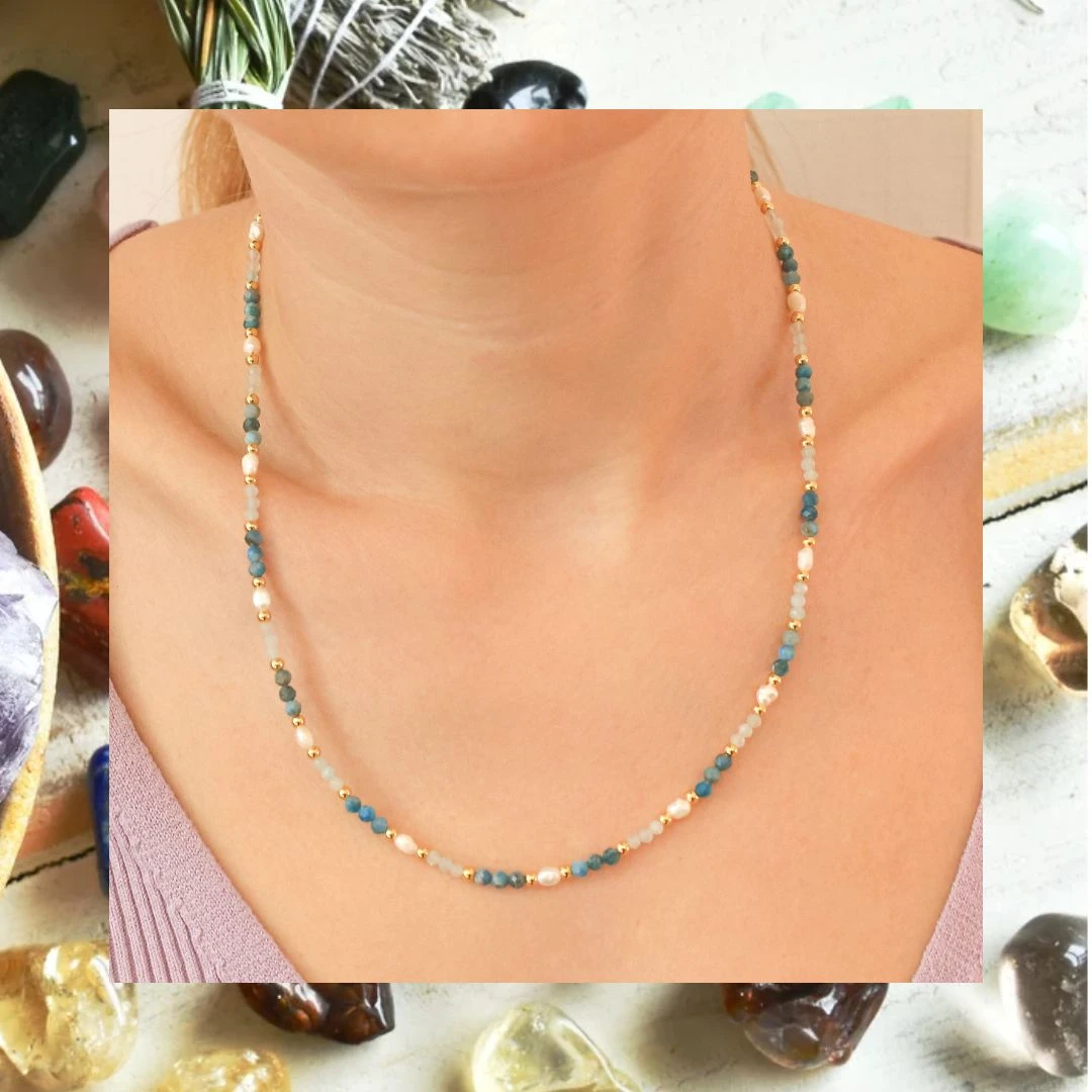 Collar de bolitas hecho a mano con piedras naturales , cristales y bolitas de acero dorado en hilo de acero por lo que es resistente