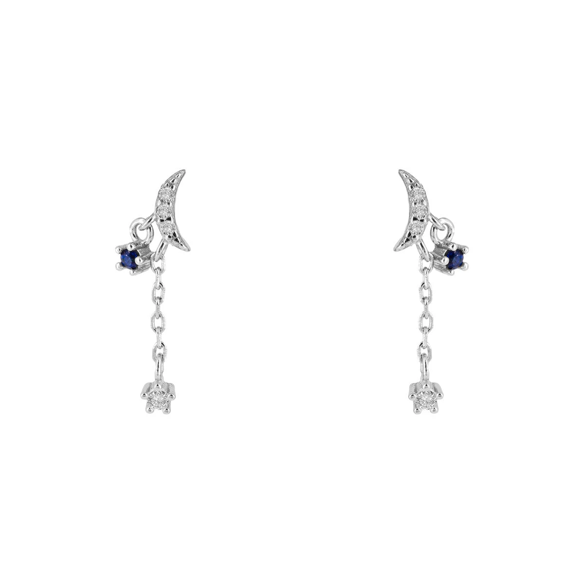 Pendientes de plata con forma de Luna unidas por una cadena por la que le caen dos pequeñas circonitas.