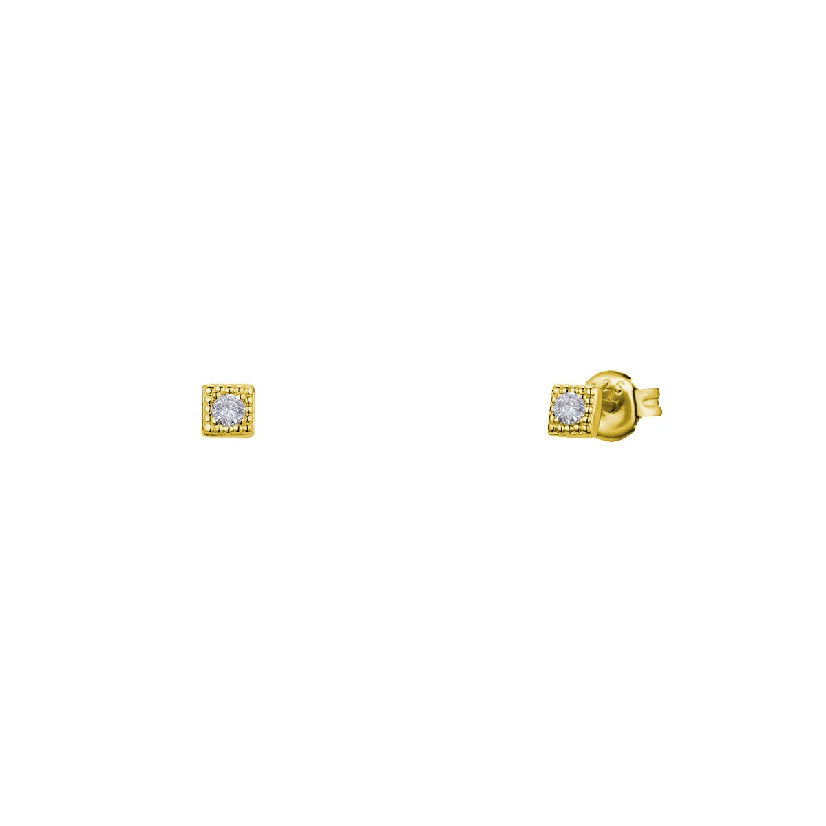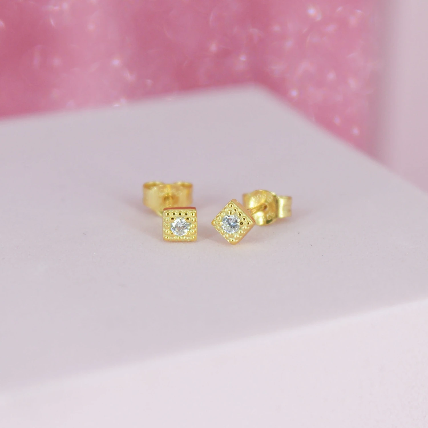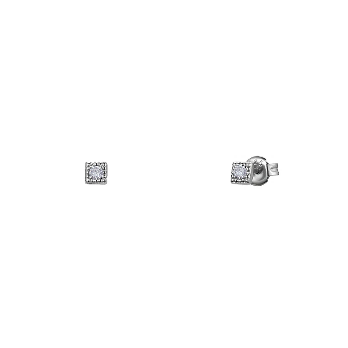 Pendientes pequeños cuadrados de plata con una pequeña circonita con forma de rombo o cuadrado, según cómo los posiciones