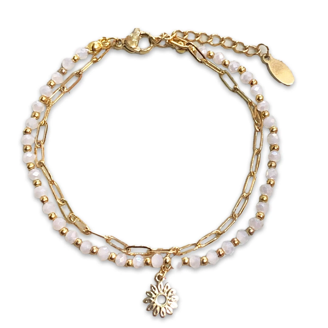 Bolitas de acero dorado y ágatas de varios colores componen esta preciosa pulsera. Además de una segunda cadena de eslabón rectangular que le otorga un toque moderno y en tendencia junto a un pequeño charm de flor.