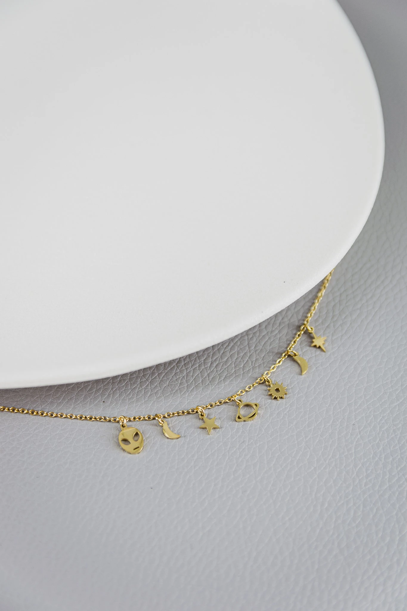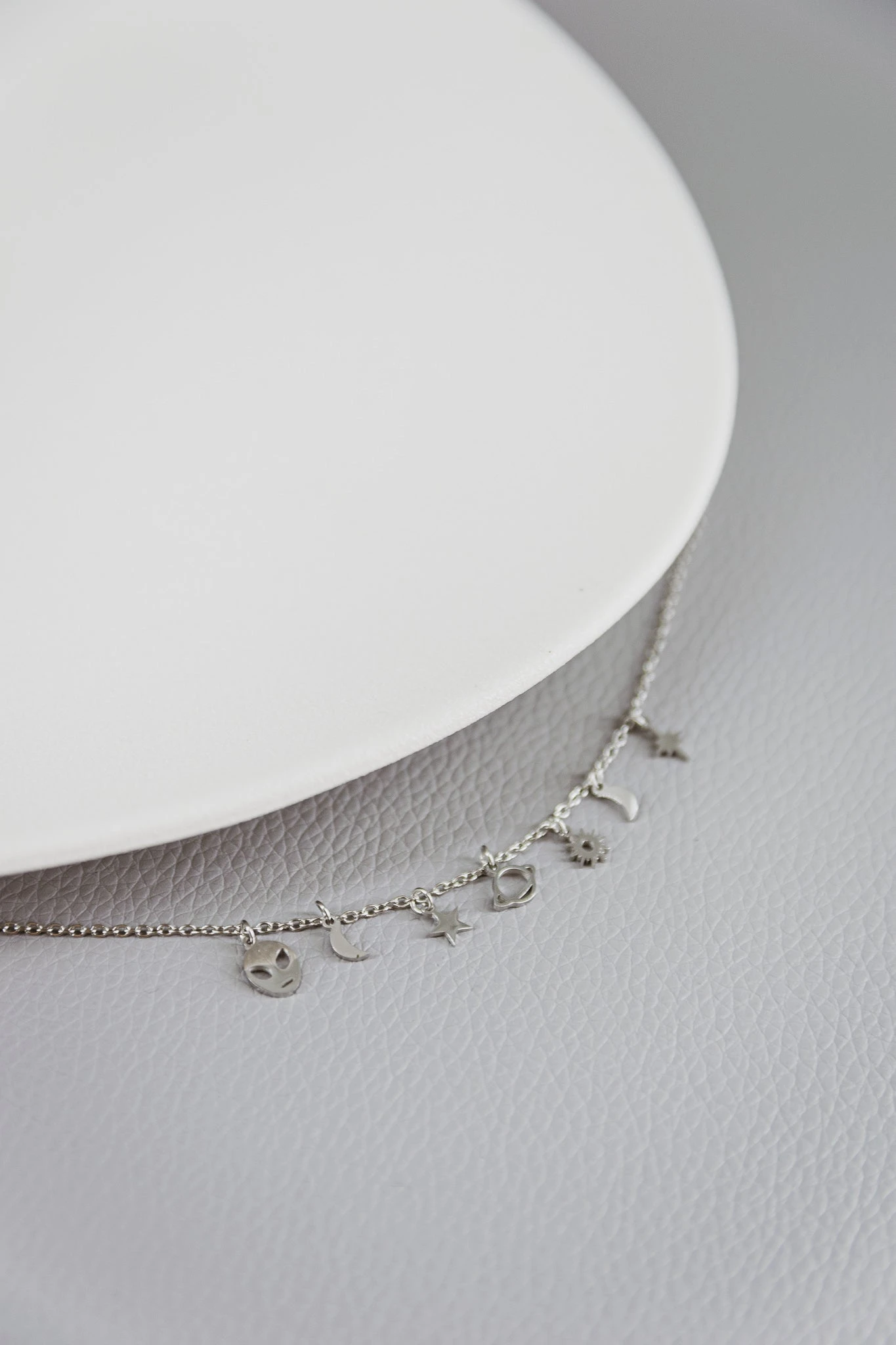 Pulsera de eslabones acompañada de Charms de Planetas, Aliens, Estrellas y Lunas