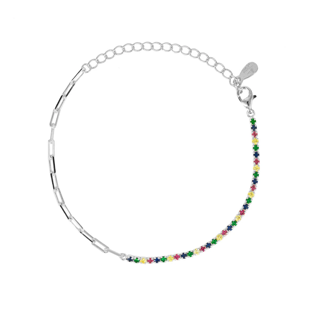 Pulsera con contraste de cadenas, por un lado pequeñas circonitas de colores engarzadas unidas a una cadena de eslabones